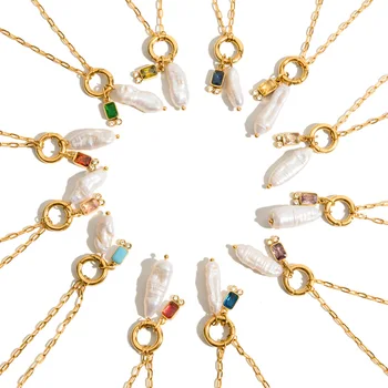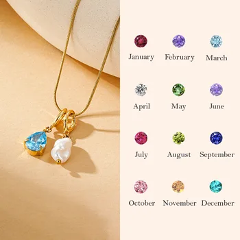 Baroque Pearl Birthstone Necklace | 18K PVD Gold Plated Stainless Steel Teardrop Gemstones Pendants | Waterproof, Hypoallergenic
