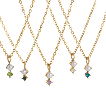 • Dainty Pearl CZ Birthstone Necklace | 18K PVD Gold Plated Stainless Steel with Pearl & Zircon Charm | Waterproof, Hypoallergenic