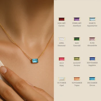 • Baguette Birthstone Necklace & Bracelet | 18K PVD Gold Plated Stainless Steel Rectangle Zircon Bar Pendant Charms | Waterproof