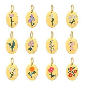 • Birth Month Flower Charms | 18K PVD Gold Plated Stainless Steel Enamel Oval Pendants with Crystal for DIY Jewelry Making