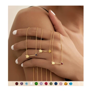 • Arrow Birthstone Necklace | 18K PVD Gold Plated Stainless Steel Minimalist Cupid Arrow 12 Birth Month Zircon Pendant for Women