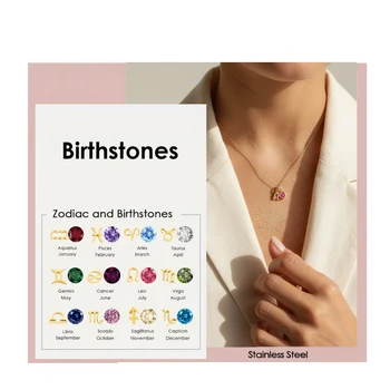 • Zodiac Birthstone Necklace | 18K PVD Gold Plated Stainless Steel Zodiac Sign & Birthstone Pendant | Waterproof & Hypoallergenic