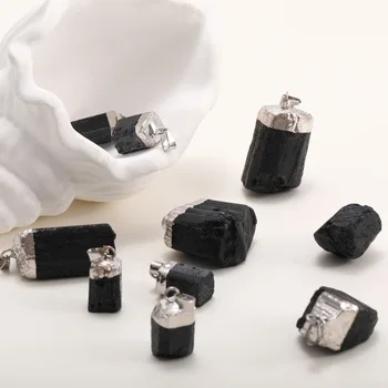 Natural Black Tourmaline Raw Stone Pendant | Silver Metal Capped Rough Gemstone Charms | Healing Crystal for DIY Jewelry Making