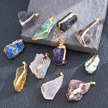Gold Edge Raw Gemstone Pendants | Assorted Electroplated Rough Nature Stones Charms for DIY Jewelry Making
