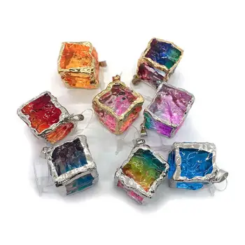 Crushed Rainbow Crystal Cube Pendant | Irregular Gradient Gemstone Square Charm with Electroplated Edges for DIY Jewelry Making