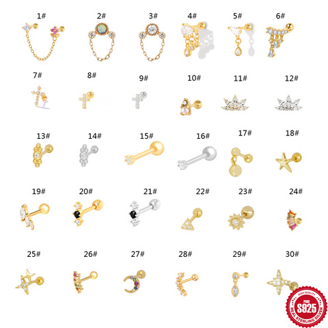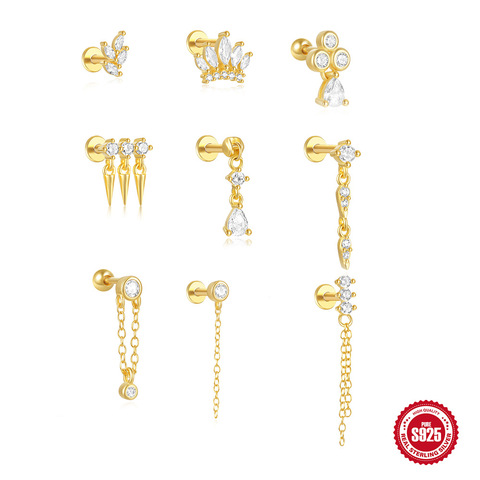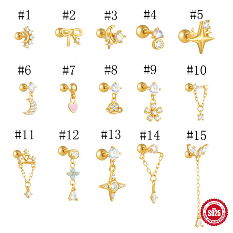 Espárragos de cartílago con rosca interna de Plata de Ley 925 | Pendientes de tuerca de cadena Cruz Luna Estrella Flor CZ para Tragus Helix Conch