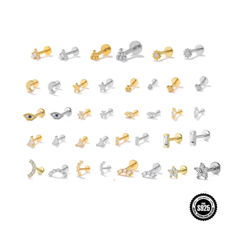 Pendientes de rosca interna de Plata de Ley 925 | CZ Cross Star Moon Heart Opal Pearl Flat Back Piercing Jewelry