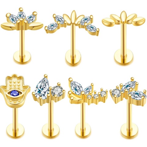 Pendientes de tuerca de cartílago con parte posterior plana de oro de Plata de Ley 925 | Conjunto de joyería de Piercing con rosca interna de racimo de hoja de ojo malvado CZ