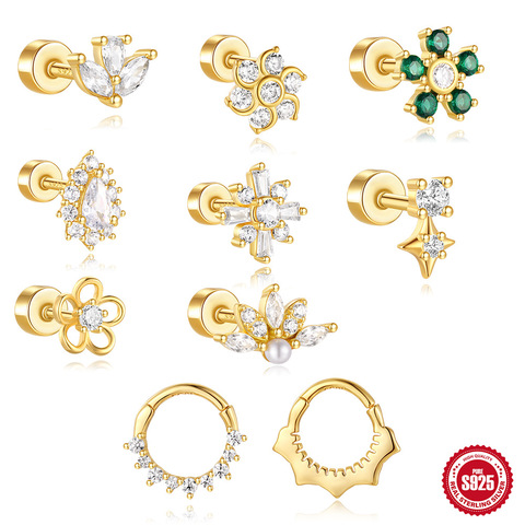 925 plata esterlina CZ flor y pendientes de tuerca geométricos internamente roscado espalda plana Piercing joyería para cartílago y lóbulo