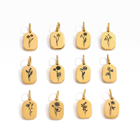 Gravado nascimento Flower Tag Pendant | 18K PVD banhado a ouro aço inoxidável 12 meses charme floral para fazer jóias | À prova d'água